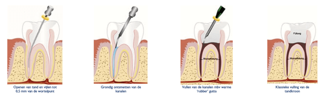 Onder de kroon van de tand bevindt zich de wortel. In iedere wortel bevinden zich een of meerdere wortelkanalen waarin zenuwvezels en kleine bloedvaten lopen (pulpa). Deze pulpa kan door tandbederf, een lekkende vulling of een val ontstoken raken en zich uitbreiden naar het omringende bot. Onder lokale verdoving wordt de tand open gemaakt en het dode/ontstoken weefsel verwijderd met kleine vijltjes en een desinfecterende vloeistof. Hierbij maken we gebruik van de meest moderne technieken (mechanische kanaalpreparatie met endo-motor en lengtebepaling via een elektronische apexlocator).
